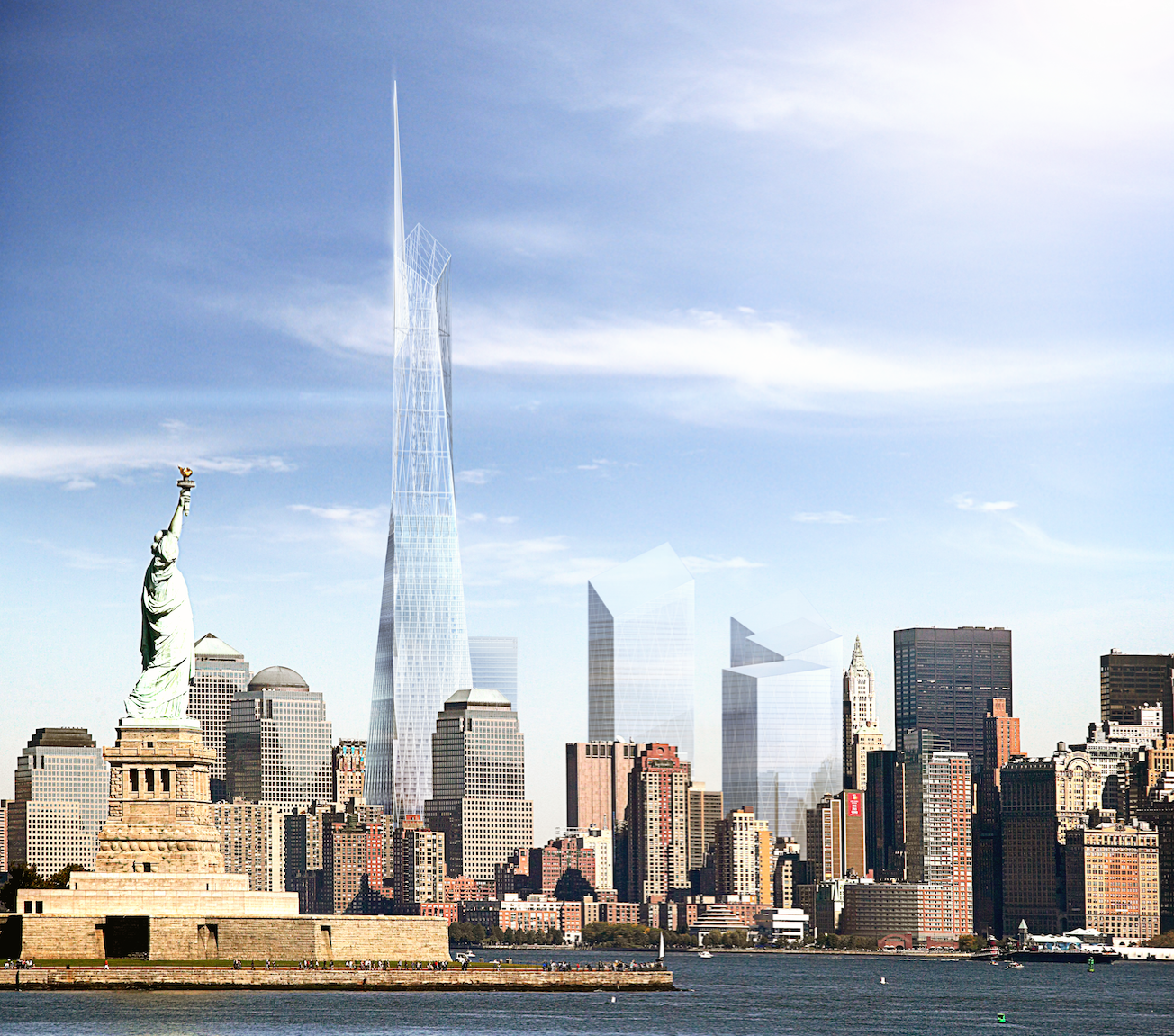 The first iteration of the 1776 foot tall iconic tower in Lower Manhattan; a twisting, faceted structure incorporating a wind farm for the generation of electricity in its upper segment.